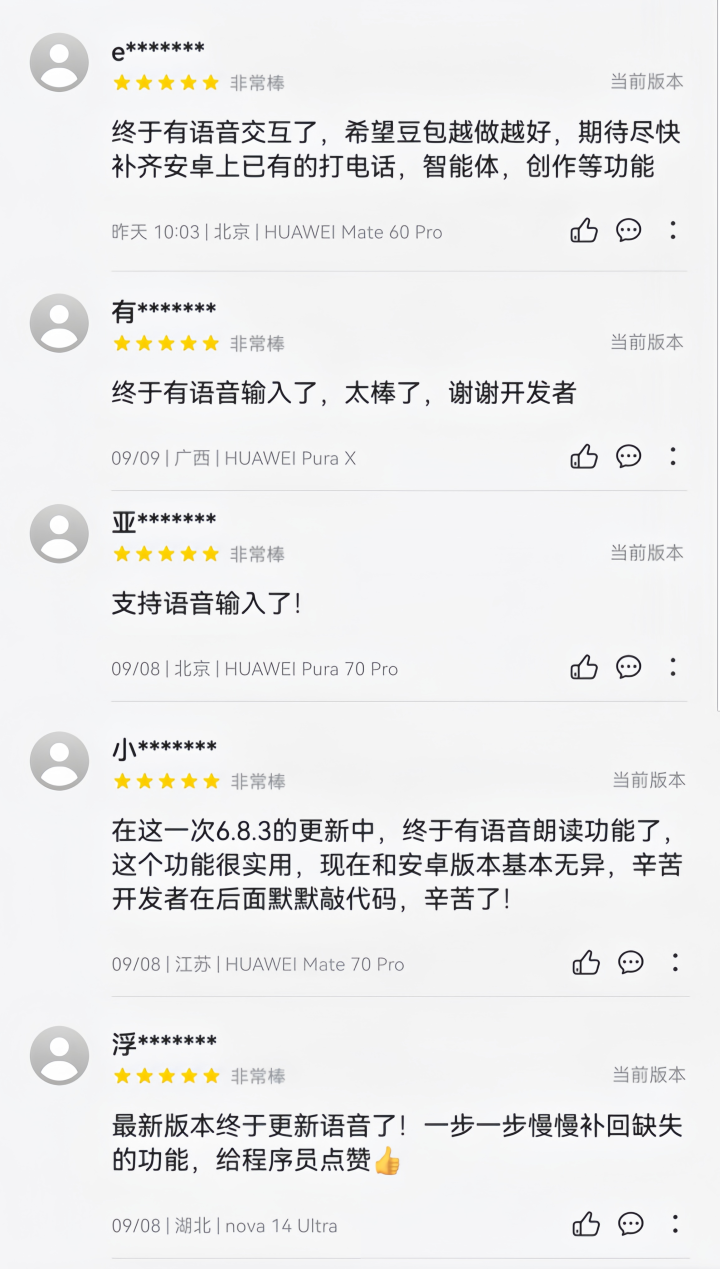 鸿蒙版豆包目前已支持文字/语音对话、联网搜索、深度思考、解读照片/图片/文件等核心功能,并且接入了鸿蒙5的安全访问机制,助力保护用户隐私。同时,豆包积极采纳用户意见,持续升级人机交互体验,其诚意也正被用户真切感知,收获了众多好评。欢迎大家前往华为应用市场更新,体验更具温度、更高效、更安全的智能服务。