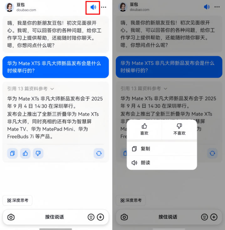 消息朗读:打开对话页面,开启右上角朗读按键,豆包的回复内容将智能转为语音,让内容直达耳畔;同时,长按对话列表中的历史消息,点击 “朗读” 选项,即可重复收听该条内容。